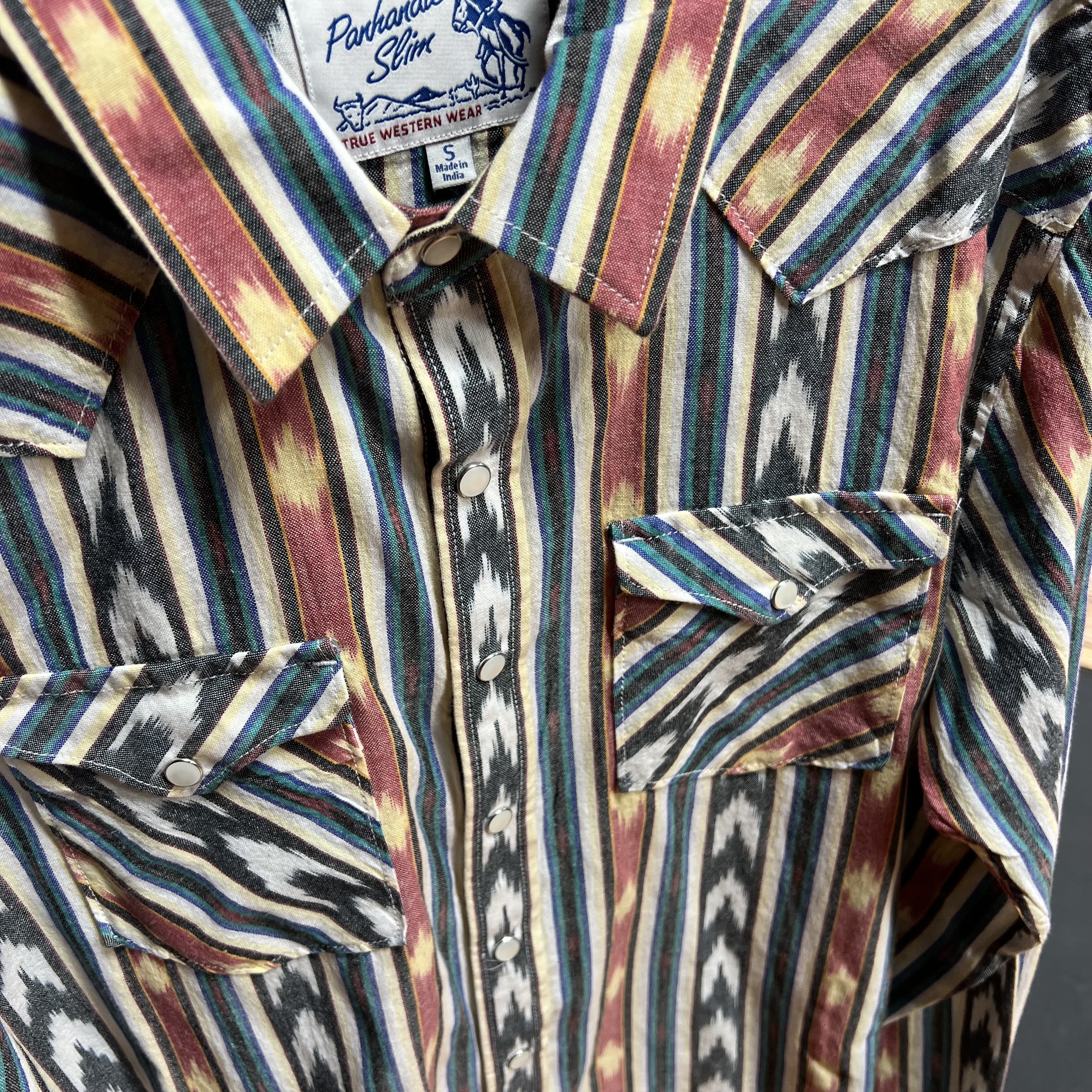 This long sleeve western shirt by Panhandle packs a punch with its multicolor vertical stripes and bold Ikat pattern. The snap buttons and double front pockets give it that authentic cowboy flair, but the color combo makes it feel fresh and fashion-forward. Whether you’re heading to a small-town get-together or just want to add some color to your day, this shirt delivers.