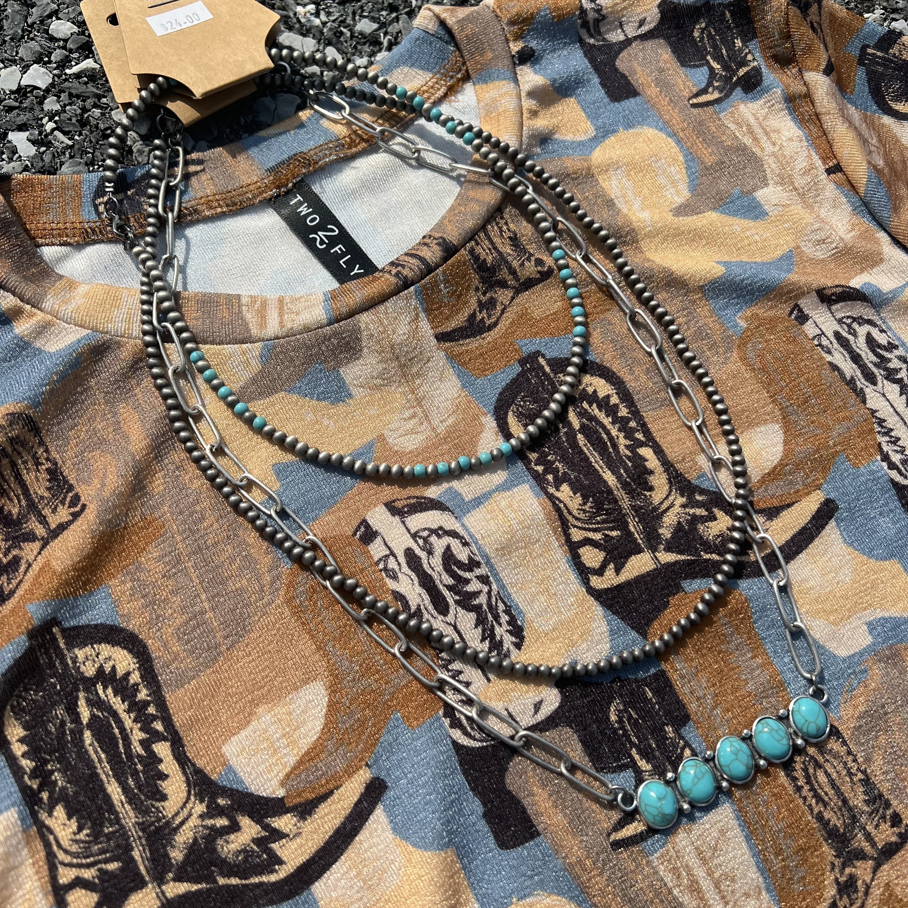 Boots on boots on boots. This all-over print tee is a total showstopper, mixing retro desert tones with a modern pattern that’s anything but basic. It’s soft, breathable, and unapologetically western. Consider it your new go-to when you want to be comfortable and cool.