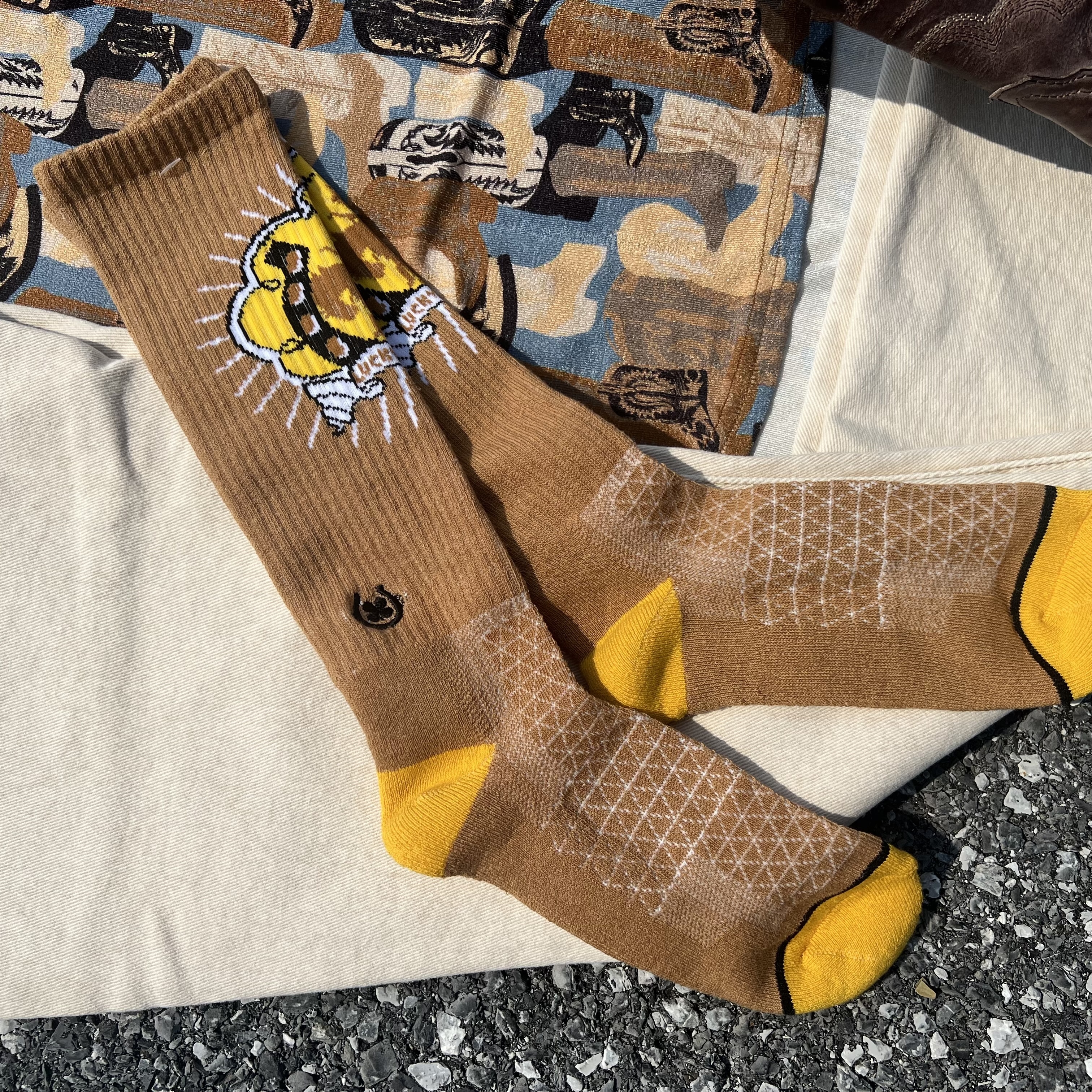 Little detail, big personality. These golden brown socks featuring a bucking bronco and a horsehoe graphic are pure joy. Peek them out under your boots for a look that says you don’t take yourself too seriously but still know how to dress.