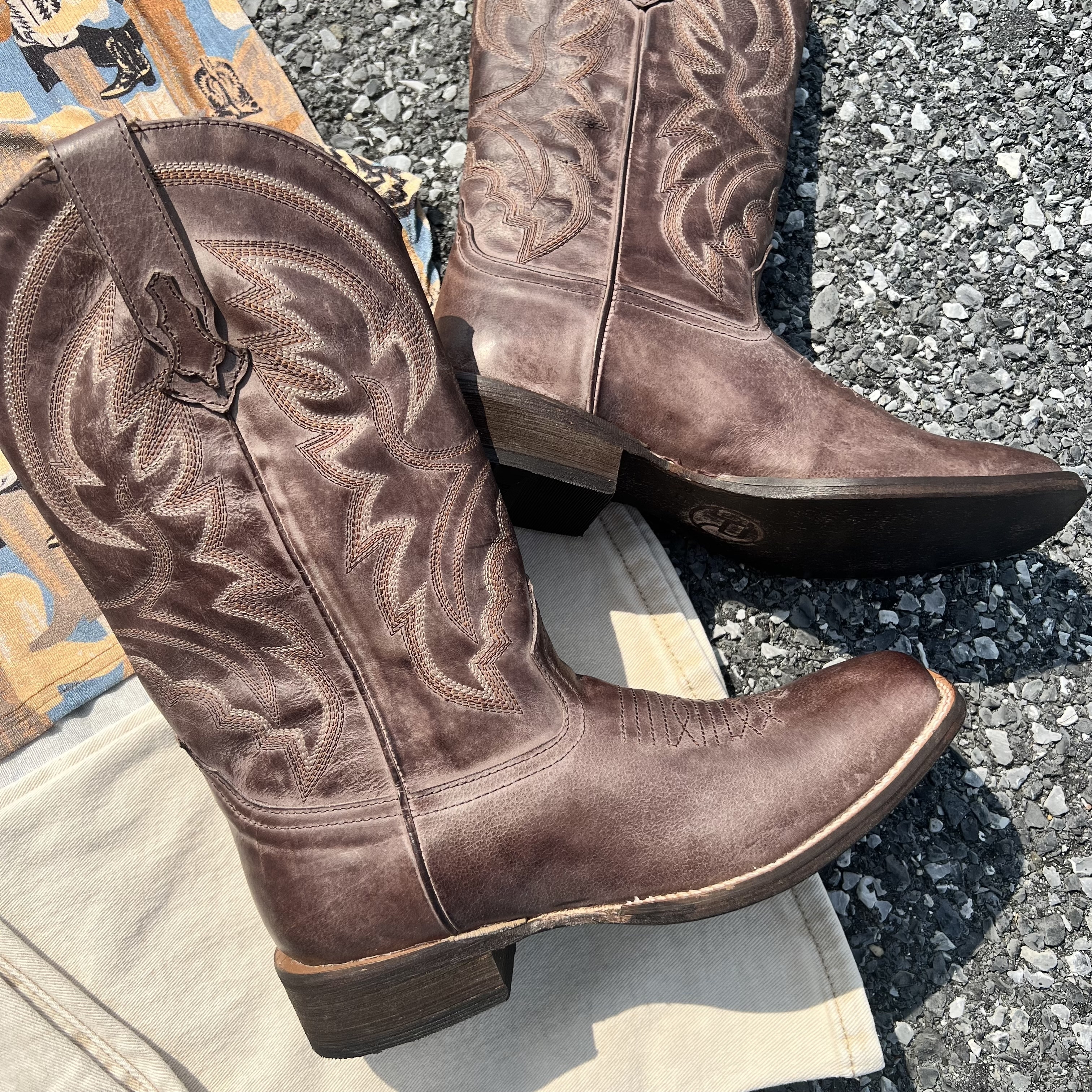 These chocolate brown cowboy boots bring just the right balance to all the color and pattern. With classic western stitching and a timeless shape, they’re your grounding piece in an outfit full of energy.