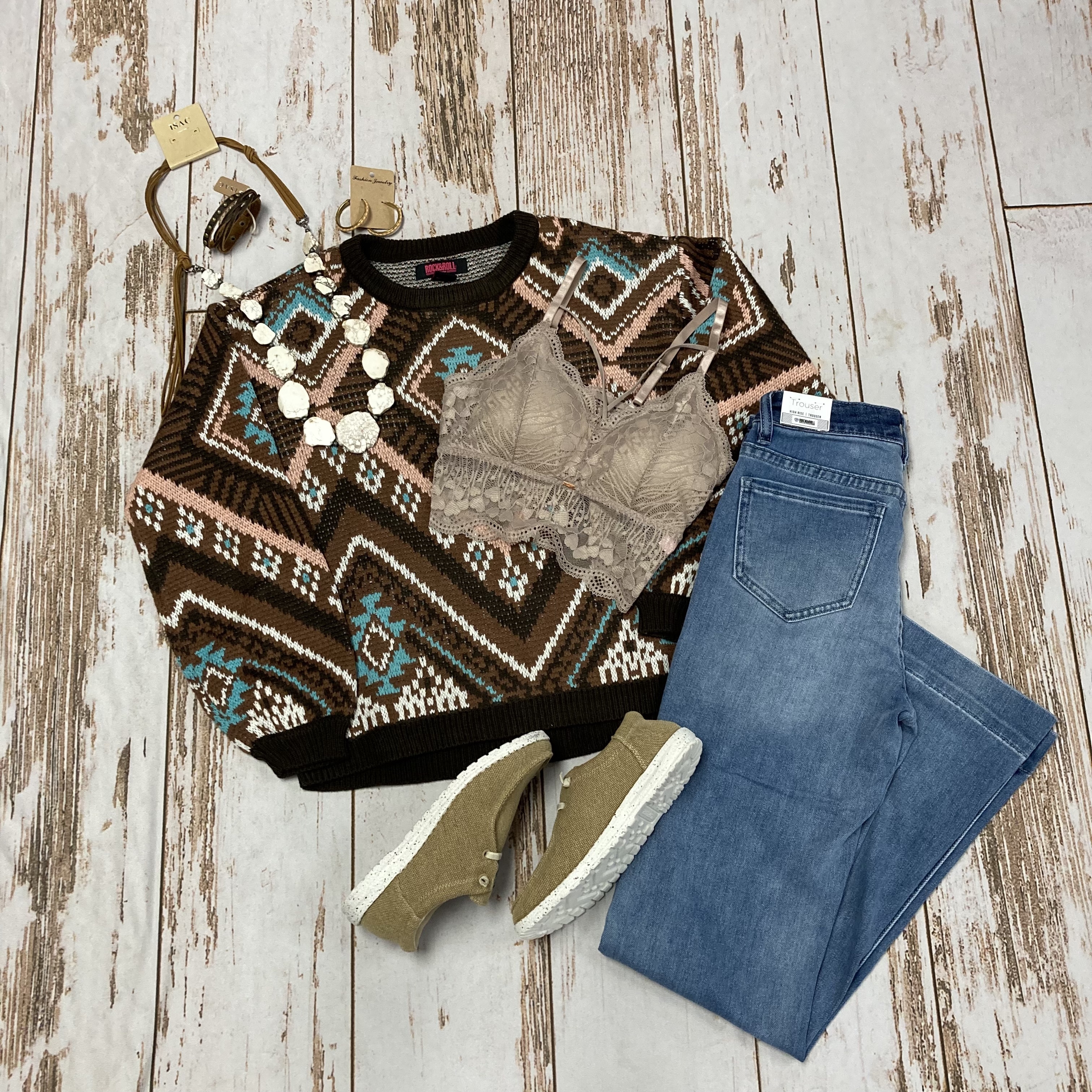 Ready to get COZY?! This outfit of the day is the perfect blend - 50% comfortable and 50% adorable! You will be nice and comfy wherever you go, and still will look great! Who doesn't want that? Our crepe luna lace bralette is cute, comfortable, and super supportive. Slip our chocolate cabin cozy sweater on top for optimal comfort and pair it with these cute Rock & Roll light wash jeans and Roper tan hang loose kicks. And of course you can't forget accessories!! Finish the look with this white turquoise tan slab necklace, leather bracelet, and camel leather corded earrings.