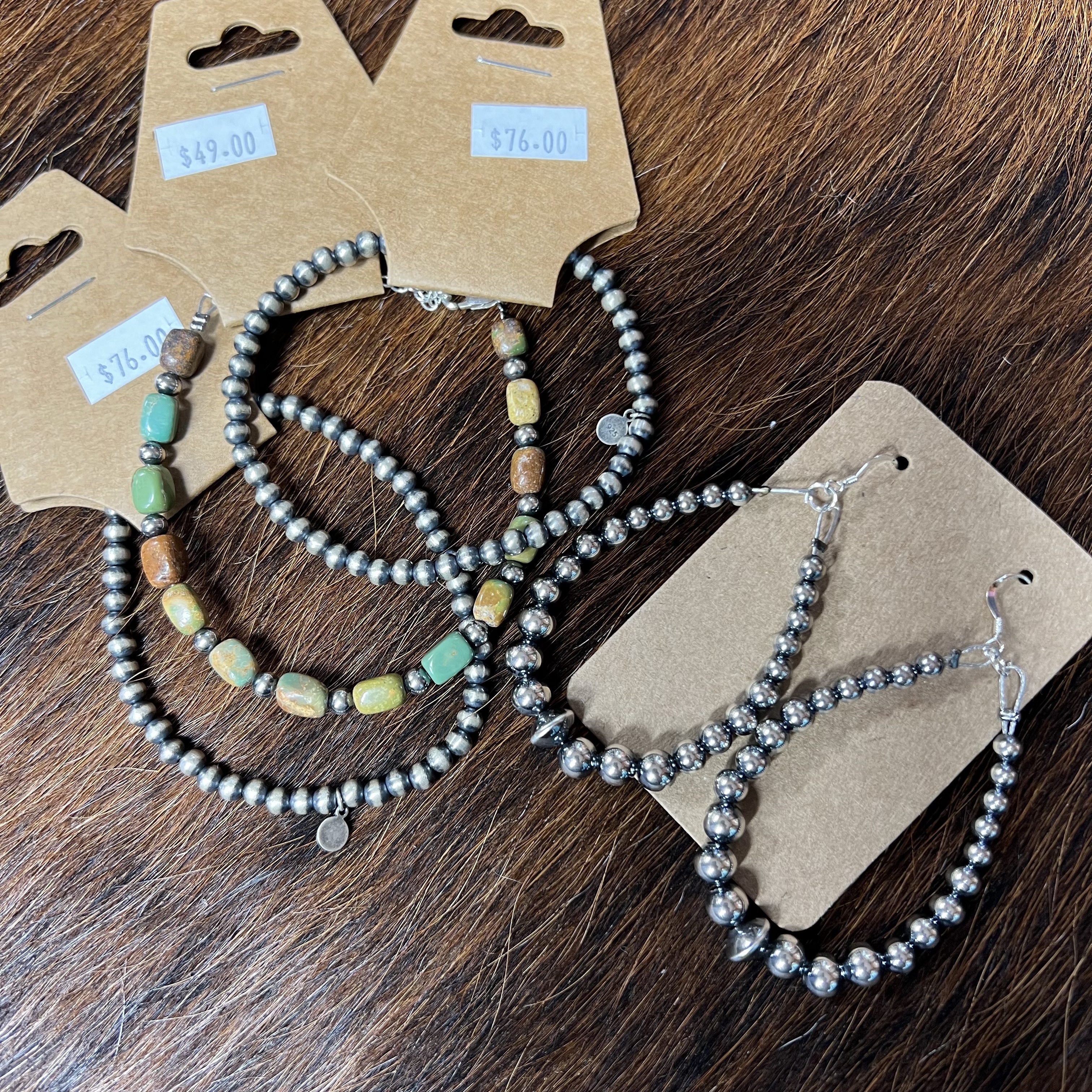 We paired this look with sterling silver beaded earrings and bracelets. We added a turquoise beaded bracelet for a touch of color. You can wear them all together or mix and match with other pieces.