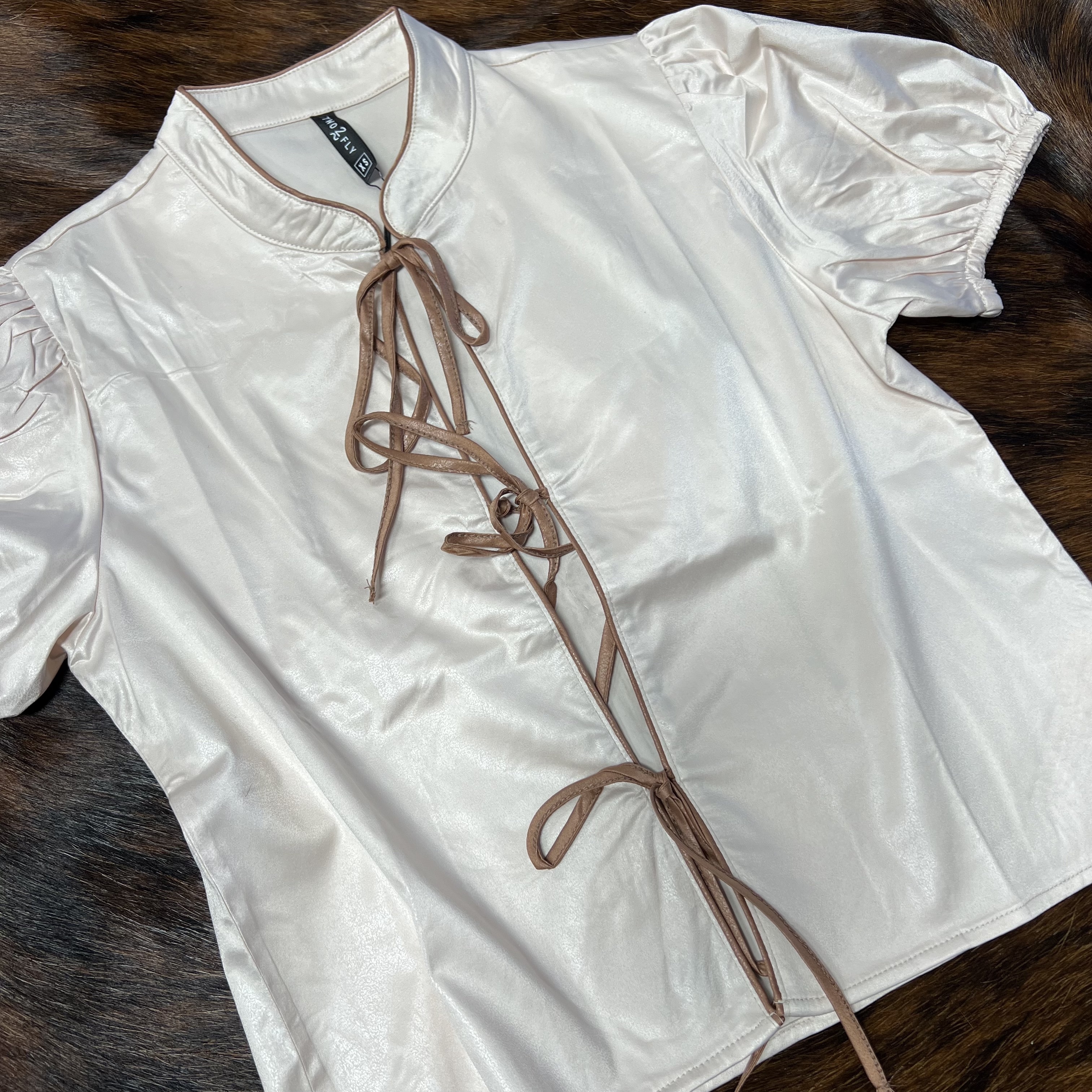 This 2FLY pearl-colored satin blouse has a subtle shine that catches the light just right. The brown ties down the front bring that rustic western edge, while the puffed sleeves keep it feminine and flattering.