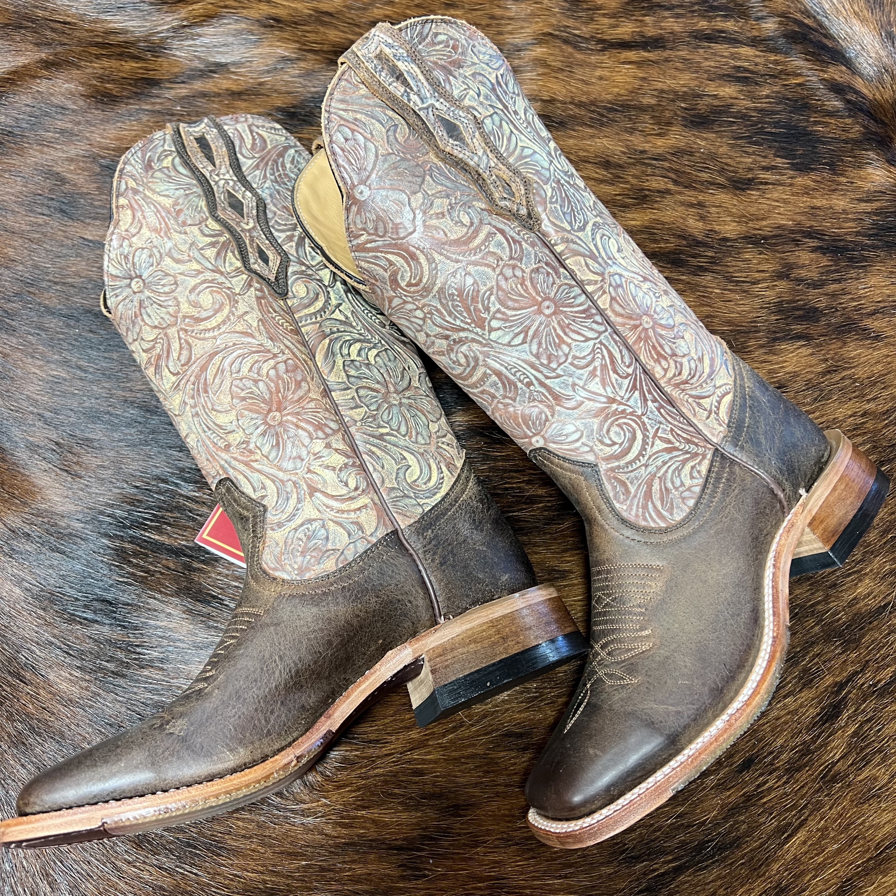 These handmade Boulet embroidered leather boots are truly something special. The beautiful painted scrollwork on the shaft with a rich brown leather foot is so perfect and match our top perfectly! These are handmade in Canada so they are sure to be durable, stylish, and last a long while.
