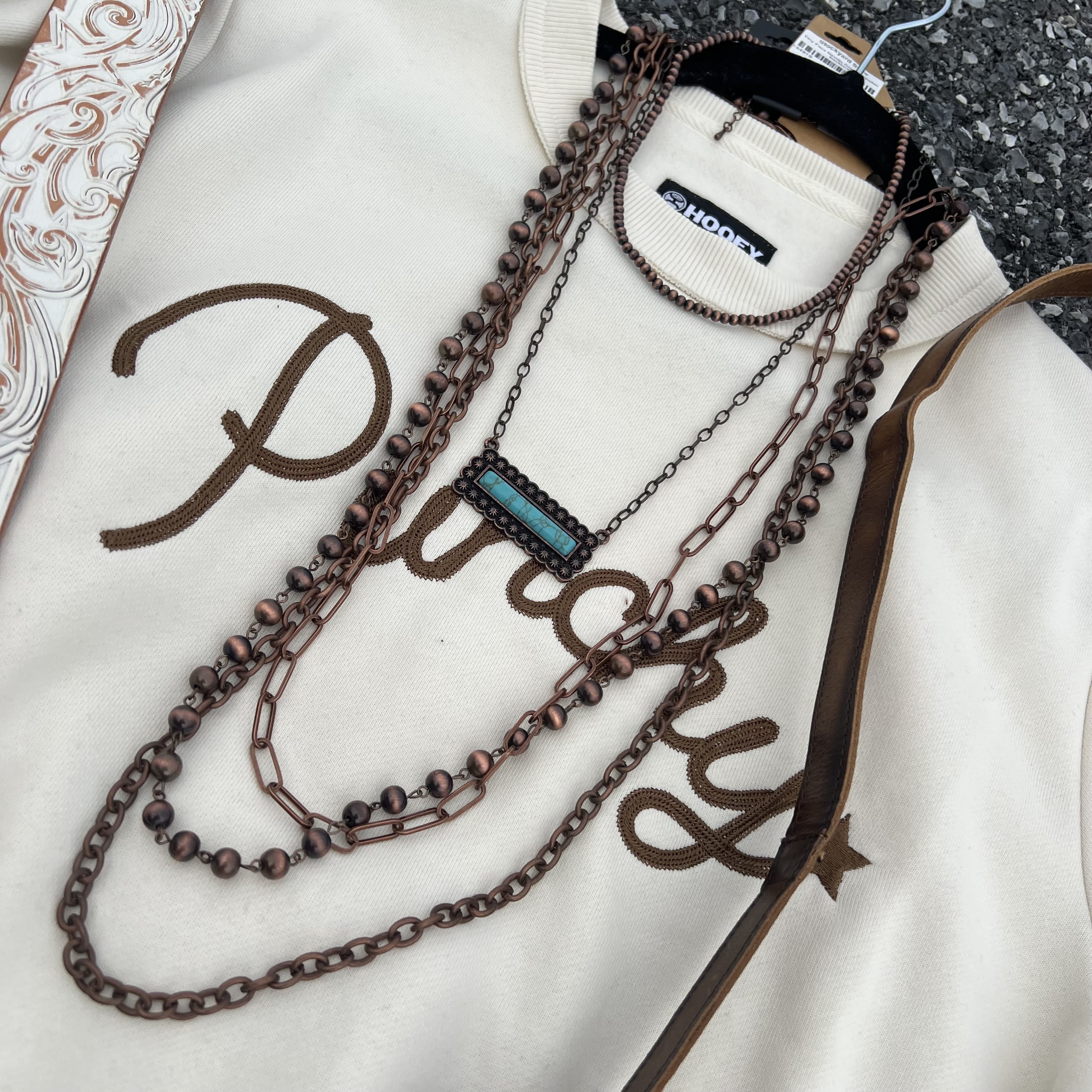Never to many necklaces!! We triple stacked this one, one being a triple already, so it looks like we really did it all here. This longer triple layered necklace also comes in silver by the way.