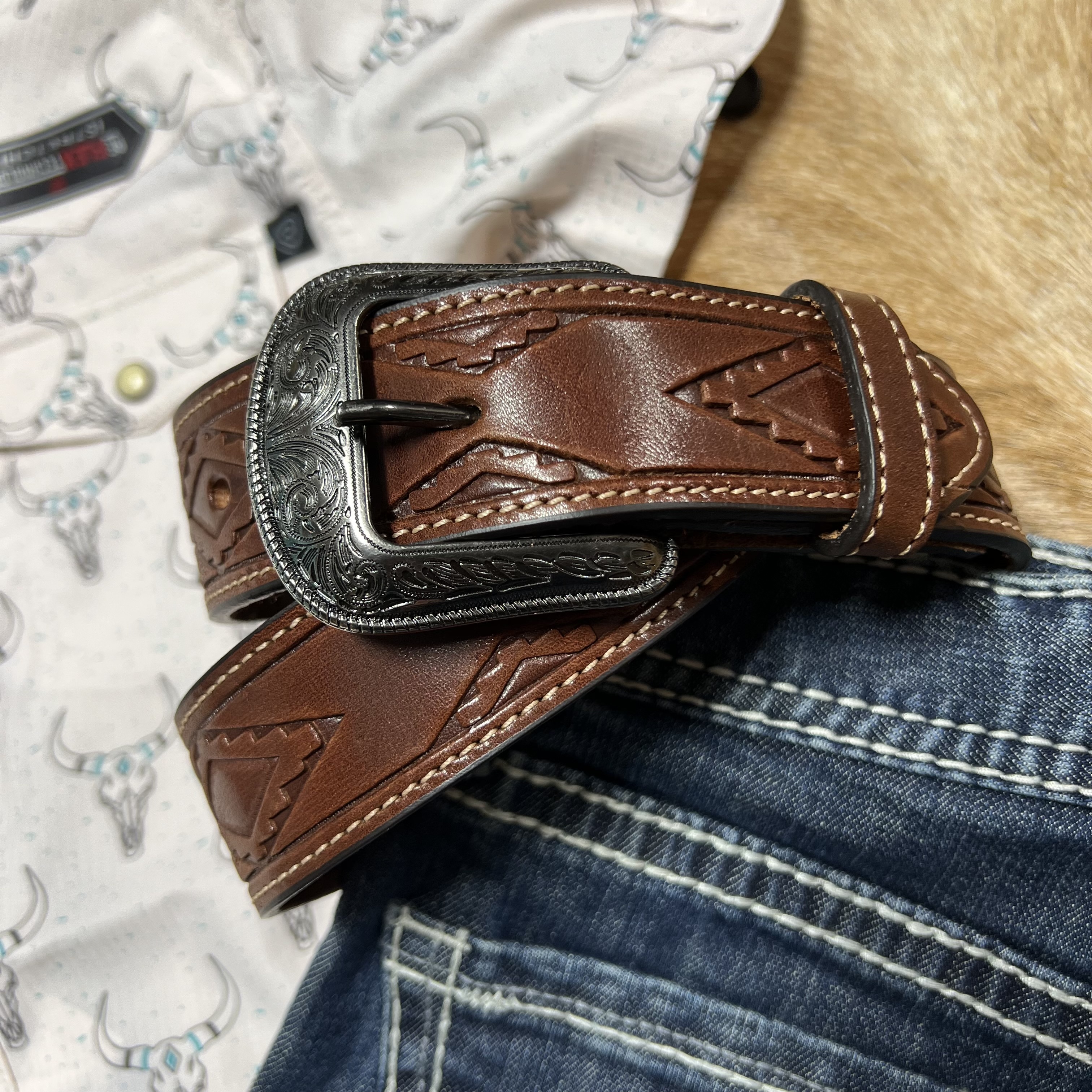 Can't be dressing to impress without a belt, like this USA made leather brown belt. This one has an aztec print, we also carry it in a basketweave, for kids and adults. These are a solid leather belt with a removable buckle so you can add your big fancy buckle!