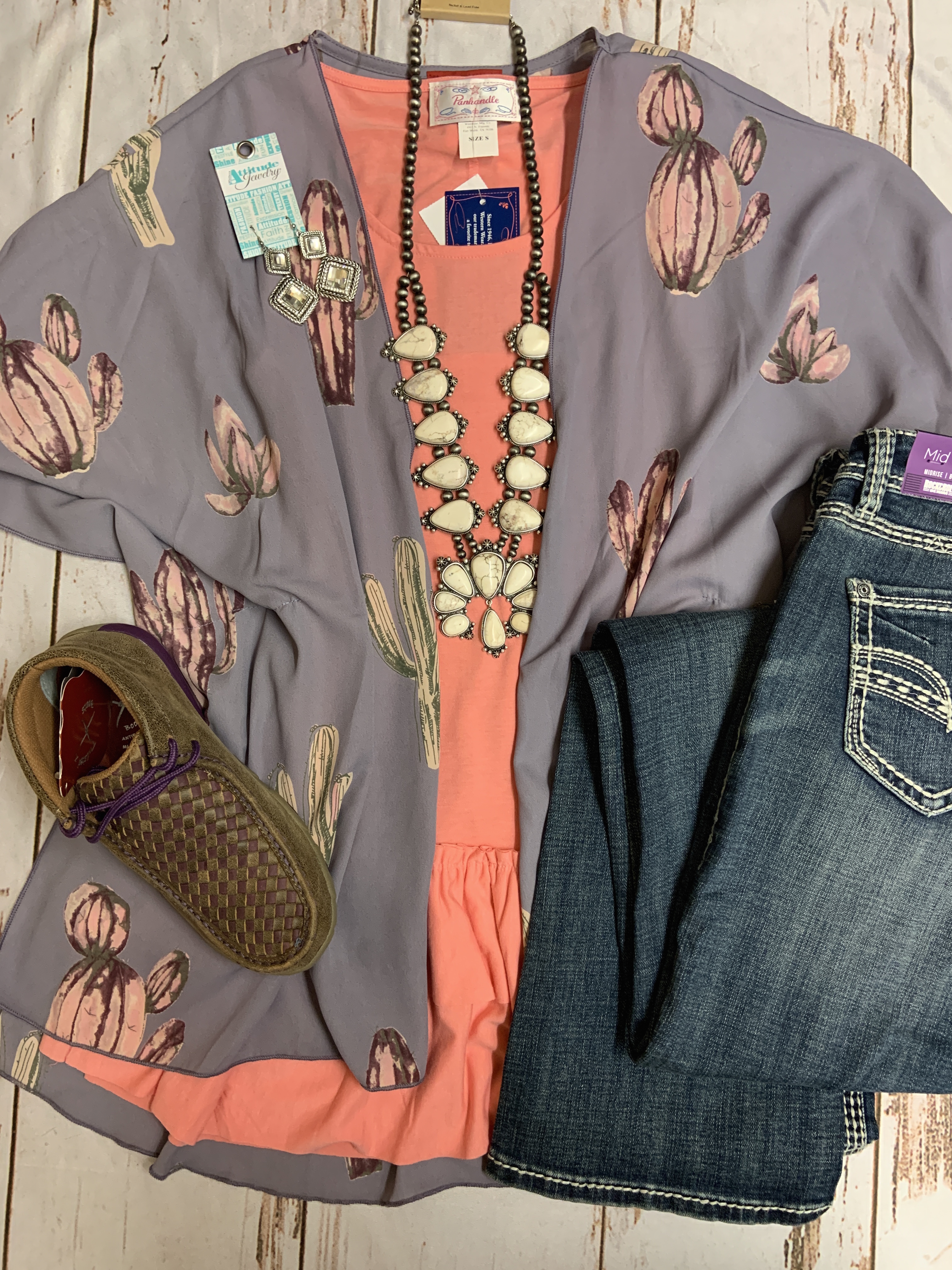 Flat Lay of the Day - 3/16/20 17th Mar 2020 Panhandle Ladies Pink Double Ruffle Tank L7T4399WDM0042 Twisted X Womens Driving MocsRock & Roll Cowgirl Mid Rise White Stitch Pocket Jean W1-4119White Turquoise Dangle Squash Blossom NecklaceMontana Attitude Dandle Square Rope Border Earrings