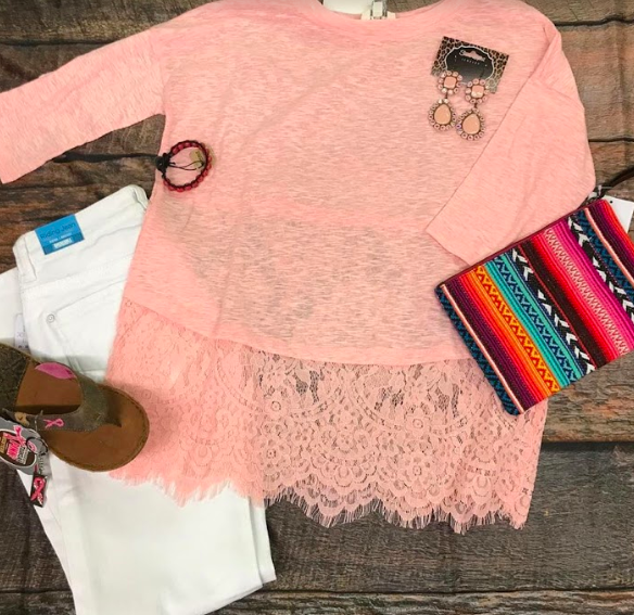 Flat Lay Of The Day - 4/25/19 26th Apr 2019 Umgee 3/4 Sleeve Tunic With Lace Trim HemRock & Roll Cowgirl White Denim Riding Jeans W7-5112Crazy Train Serape Fabric ClutchPink Beaded Leather Bracelet By Noble OutfittersWomen's Pink Hand Stitched Leather Wrapped Sandal WLW0003Same Spirit Pink Square and Teardrop Earrings