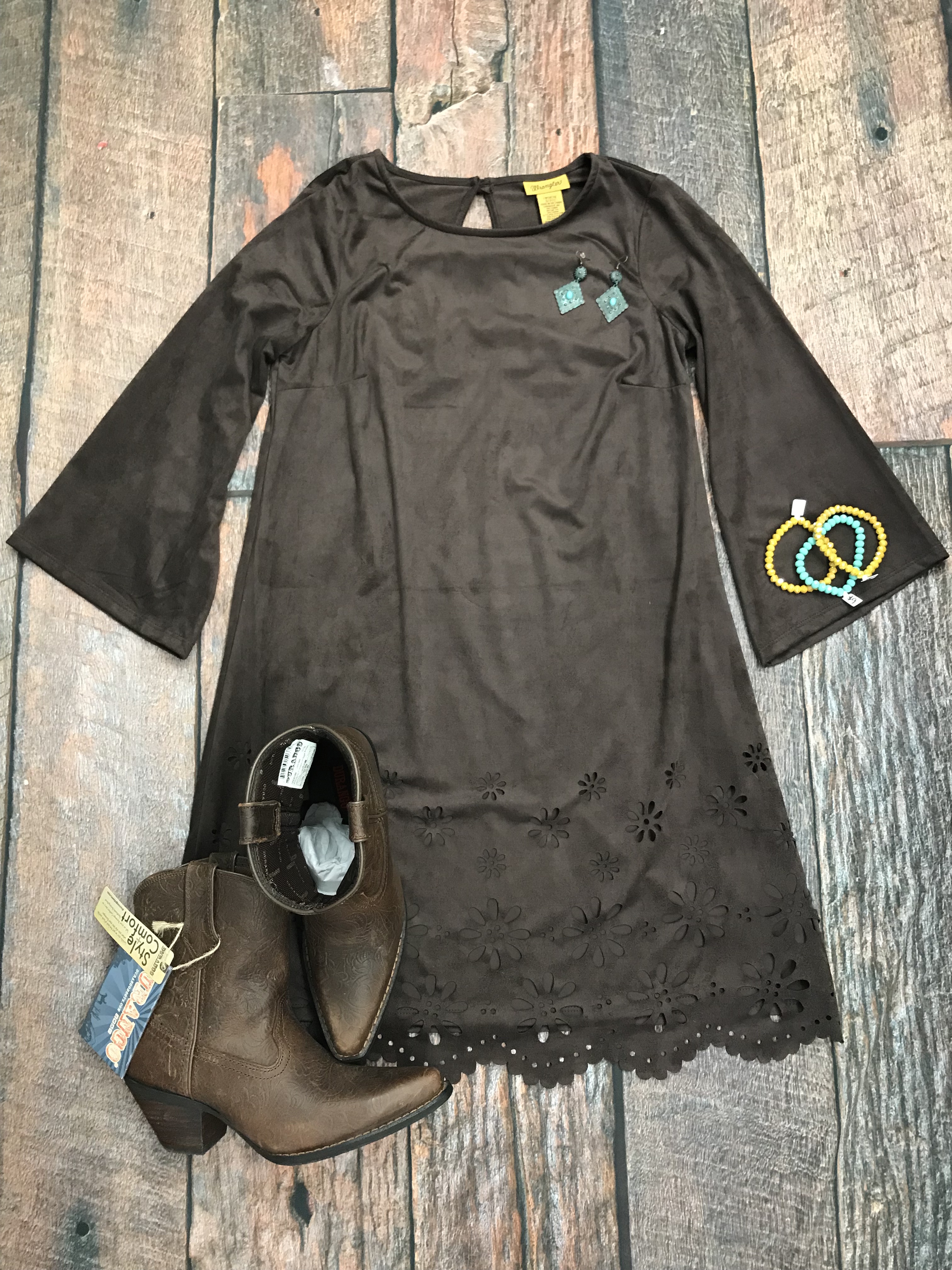 Flat Lay Of The Day - 5/20/19 22nd May 2019 Wrangler Brown 3/4 Sleeve Dress with Floral Cutout HemDurango Women's Western Embossed BootieStretchy Crystal Bead BraceletsTurquoise Patina Diamond-Shaped Earrings