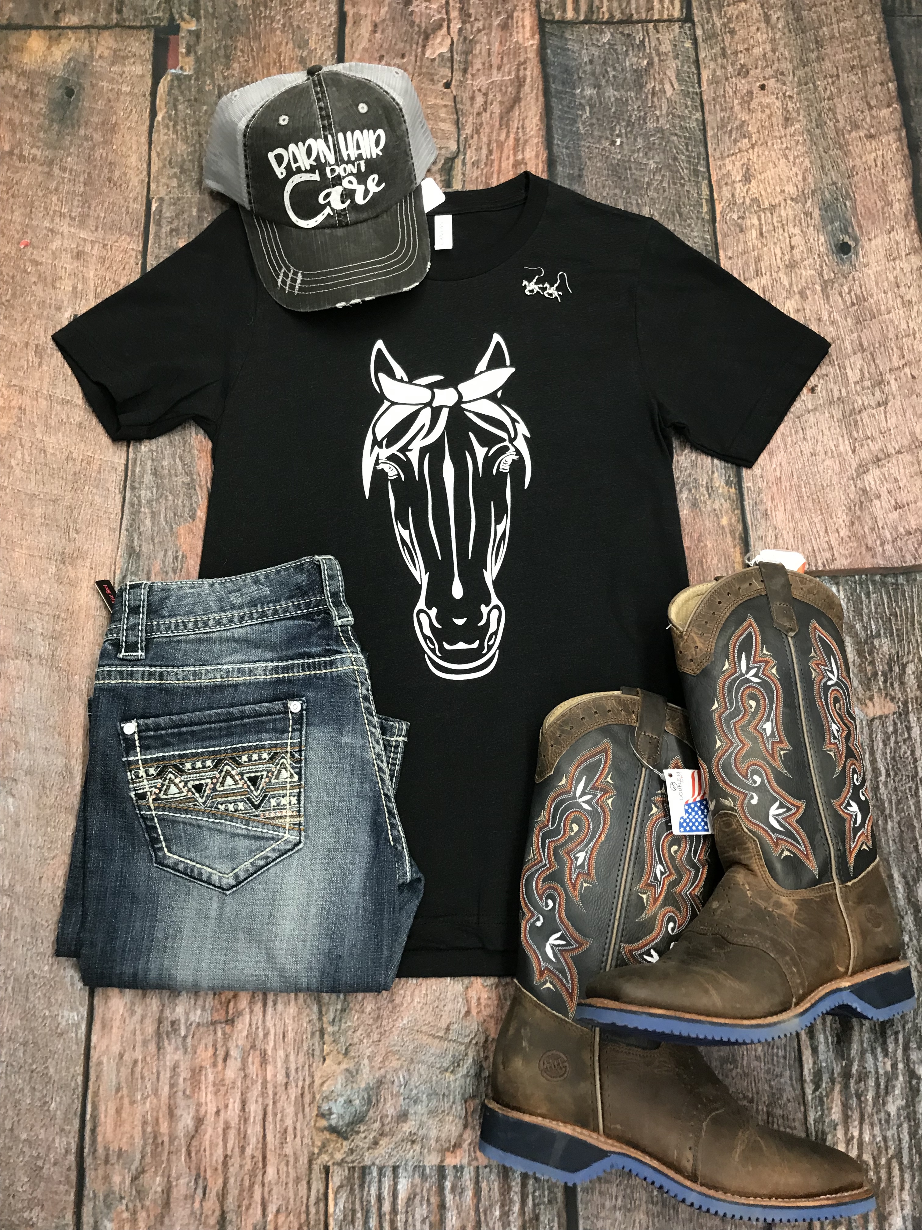 Flat Lay Of The Day - 5/23/19 23rd May 2019 Glitter Bandana Horse Tee - BlackBarn Hair Don't Care Glitter Ball CapHorse Dangle EarringsRock & Roll Cowgirl Multi Colored Aztec Design Low Rise Jeans W0-9605Double H Blue and Brown Square Toe Boots