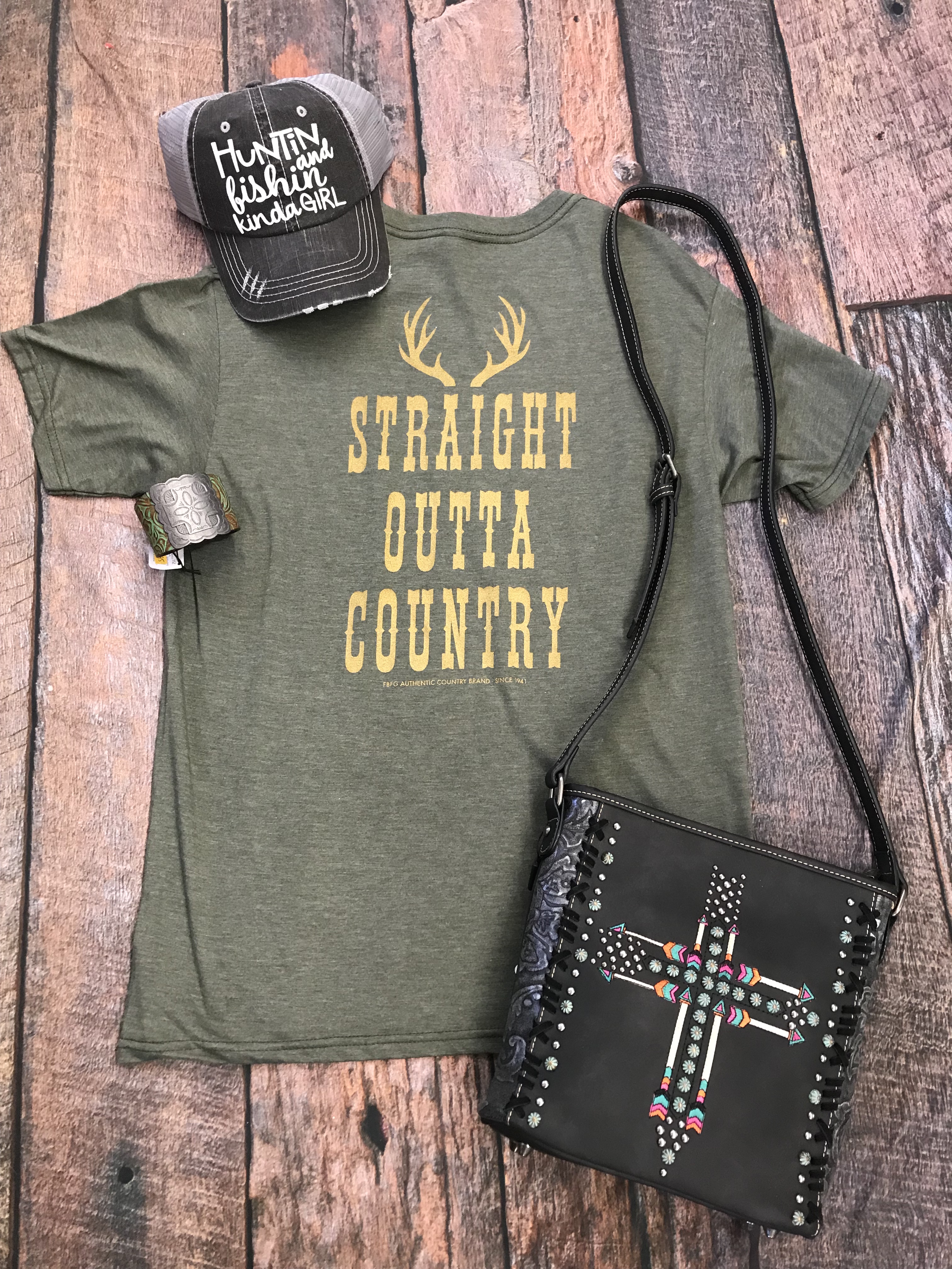 Flat Lay Of The Day - 7/01/19 9th Jul 2019 Turquoise Tooled Vintage Navajo Bracelet By Noble OutfittersHuntin Fishin Kinda Girl Glitter Ball CapMontana West Black Aztec Cross Crossbody Concealed Carry BagStraight Outta Country Tee