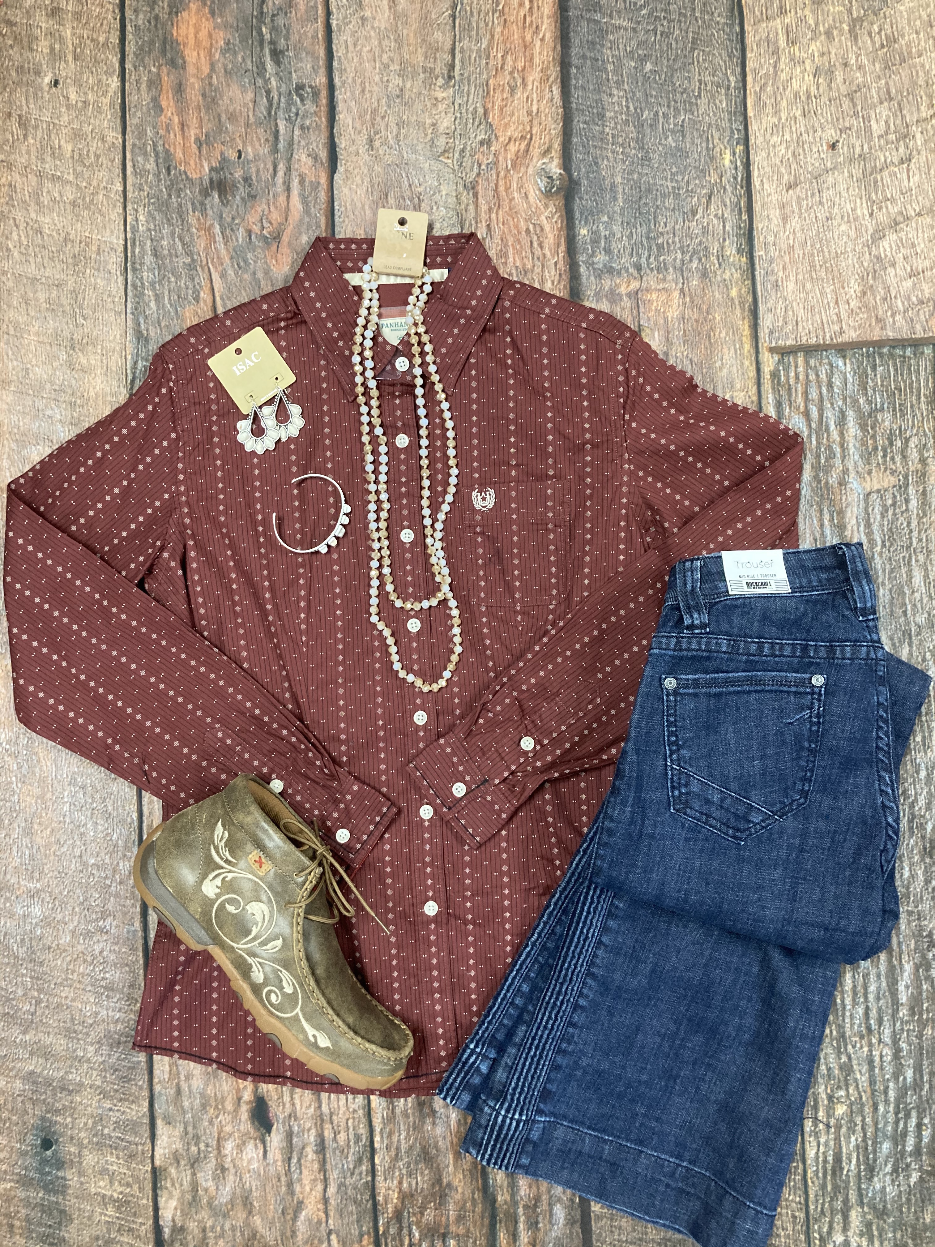- Panhandle Rough Stock Ladies Maroon Pattern Button Down Shirt R4B3179