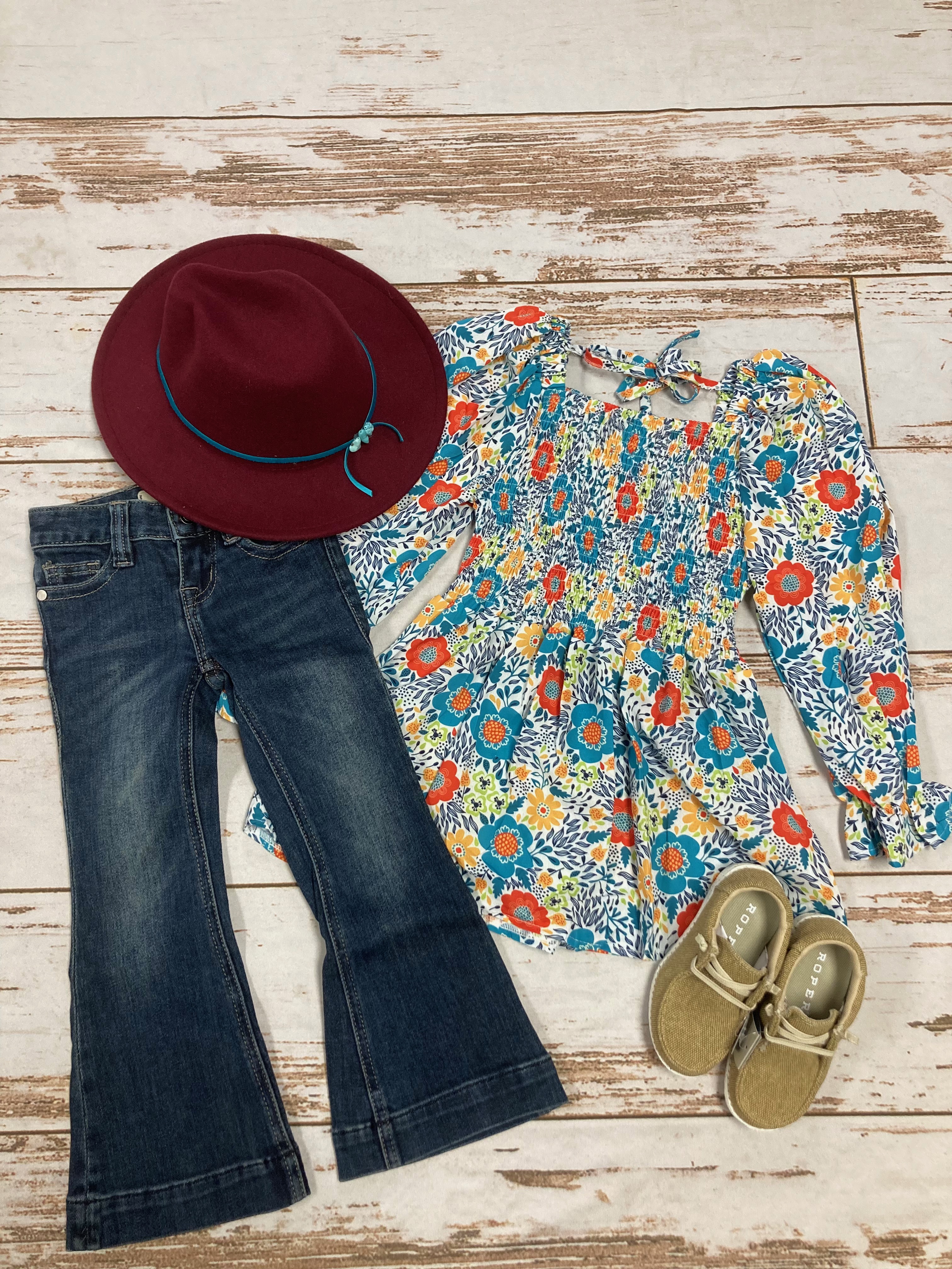 How adorable is this little girl's outfit?! If only it came in an adult size. This look is perfect for church, family pictures, attending a wedding, or anytime your little cowgirl feels like! This look features a vibrant floral blouse, Rock & Roll dark washed trousers, Roper tan Hang Loose shoes, and to top it all off (pun intended), a boho maroon hat.