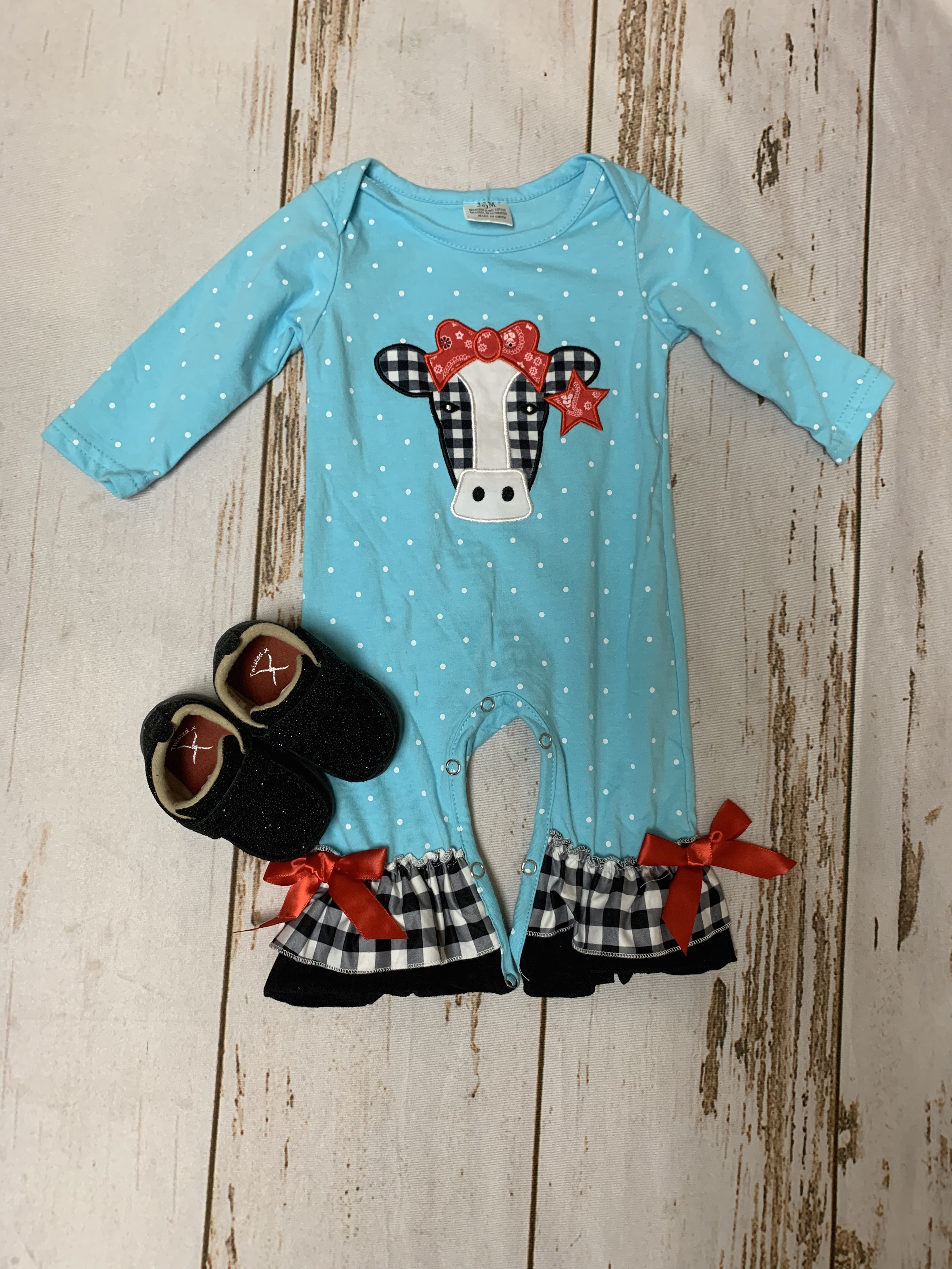 This super cute outfit is great for your infant any day of the week, but is absolutely perfect for an animal themed birthday party! The outfit of the day features a polka dot moo romper, and Twisted X black shimmer infant mocs.