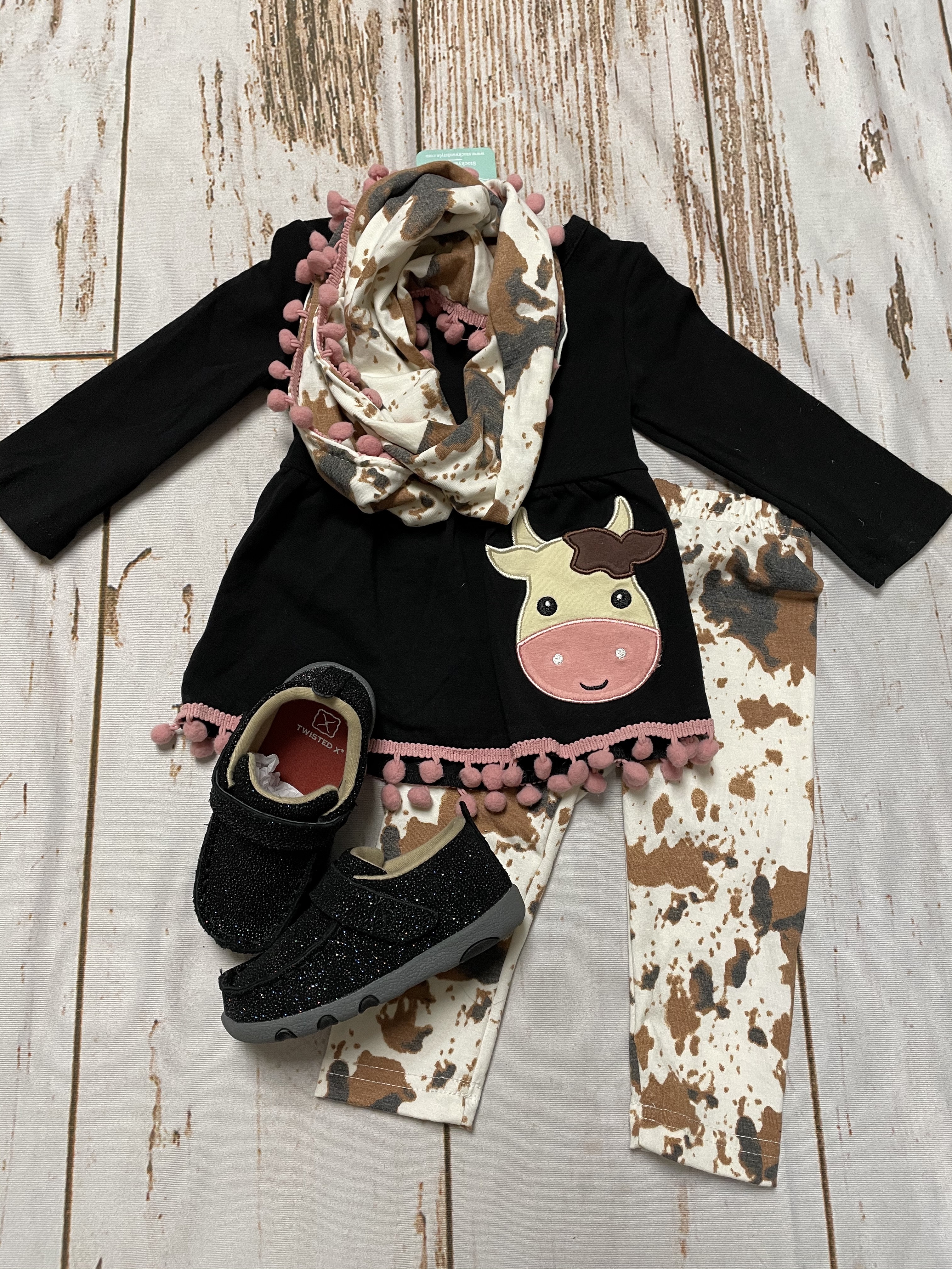 This little girl's outfit of the day is perfect for an everyday look, especially transitioning from late winter to spring! You cannot go wrong with this adorable three piece set and the black shimmer twisted x moc!