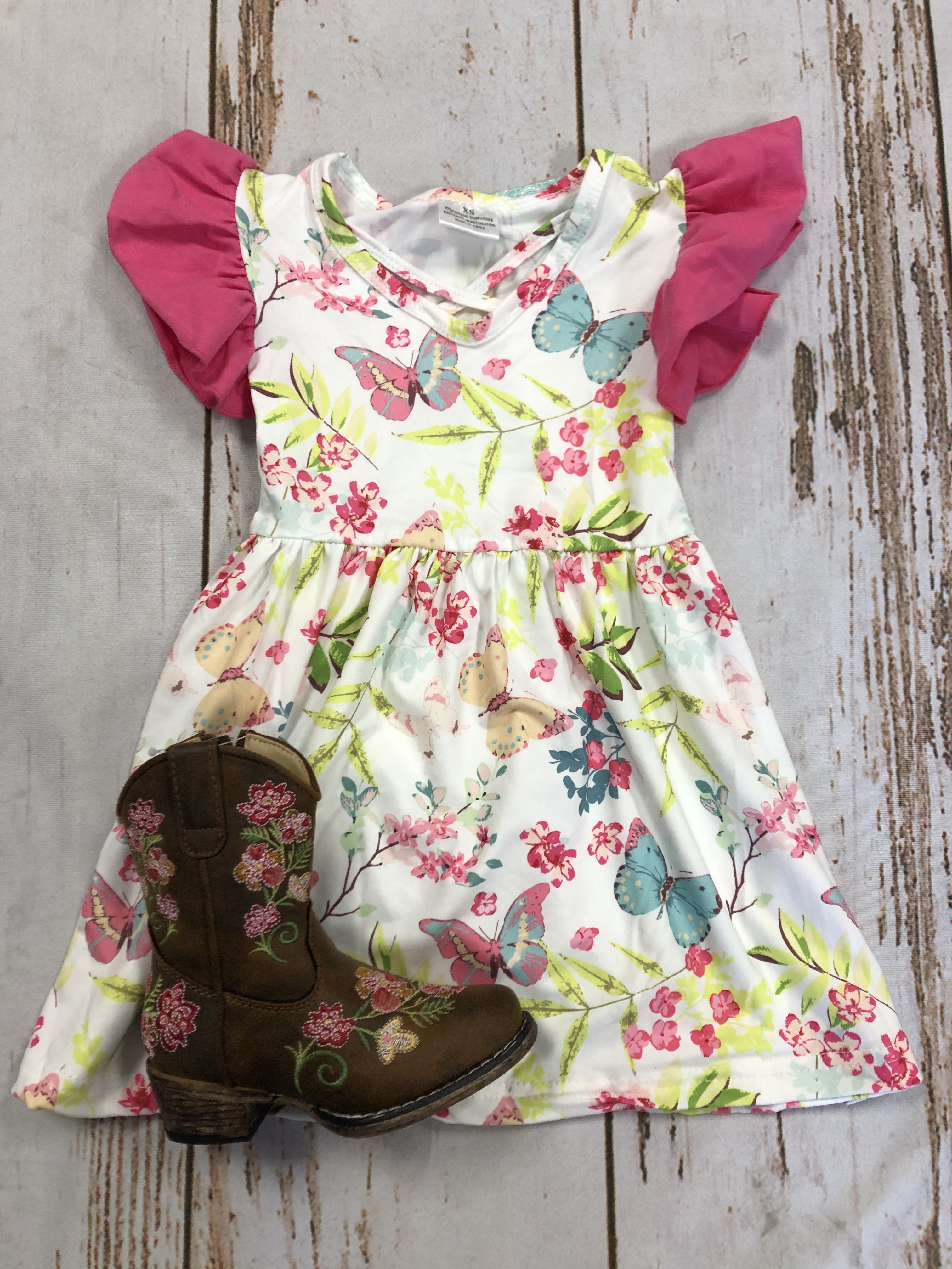 Such a cute, simple outfit for any little girl! Features a Criss Cross Neckline Butterfly Dress and Roper Juliet Flower Snip Toe Boot.