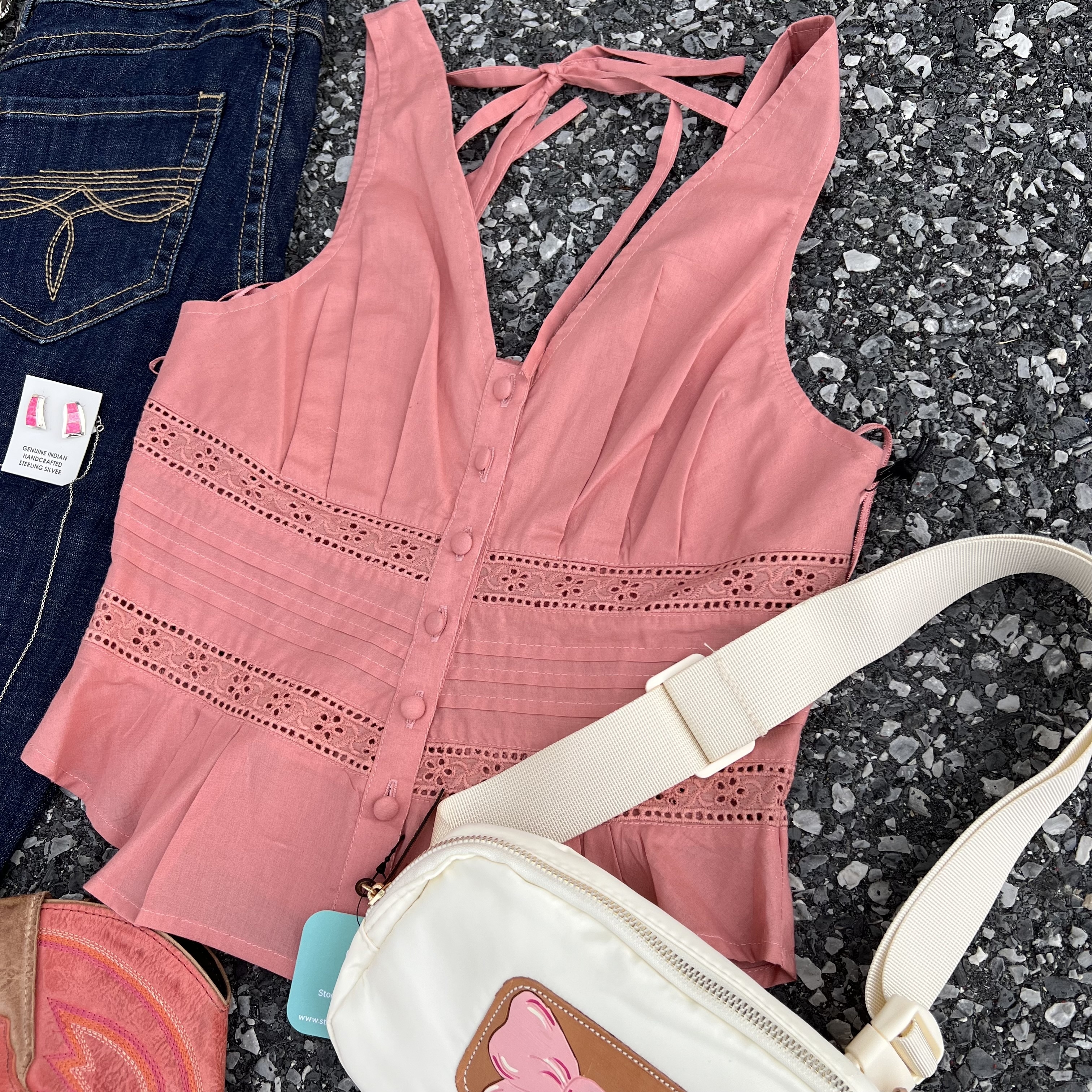 This rose pink top is all about warm weather confidence. Featuring delicate eyelet detail, flattering vertical seams, and a button-down front, it hugs just right while keeping things breathable and breezy. It’s the kind of top that works for a day in the sun or a night under the stars.