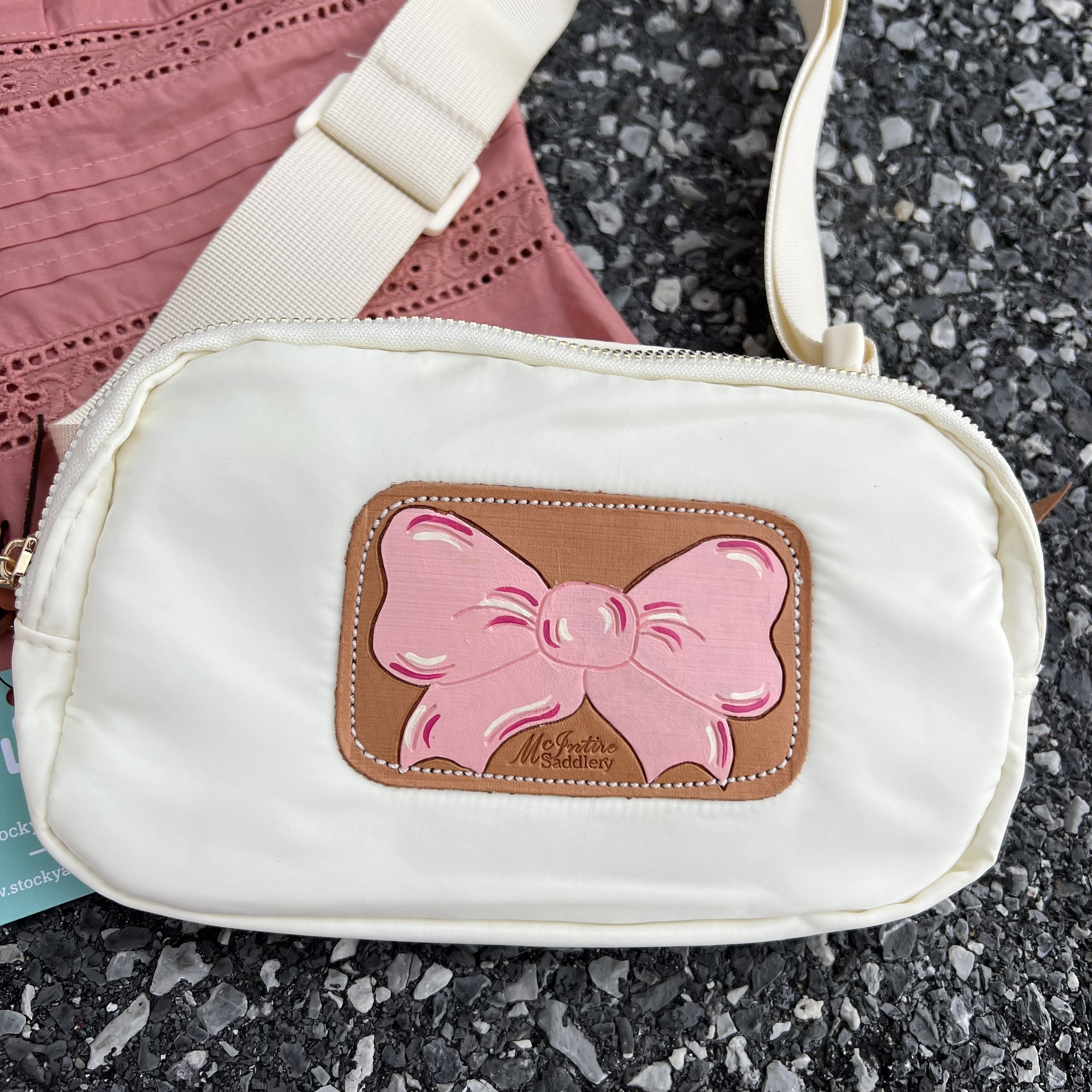 A cream belt bag purse with a leather bow patch: cute, compact, and just enough sass to elevate your look.